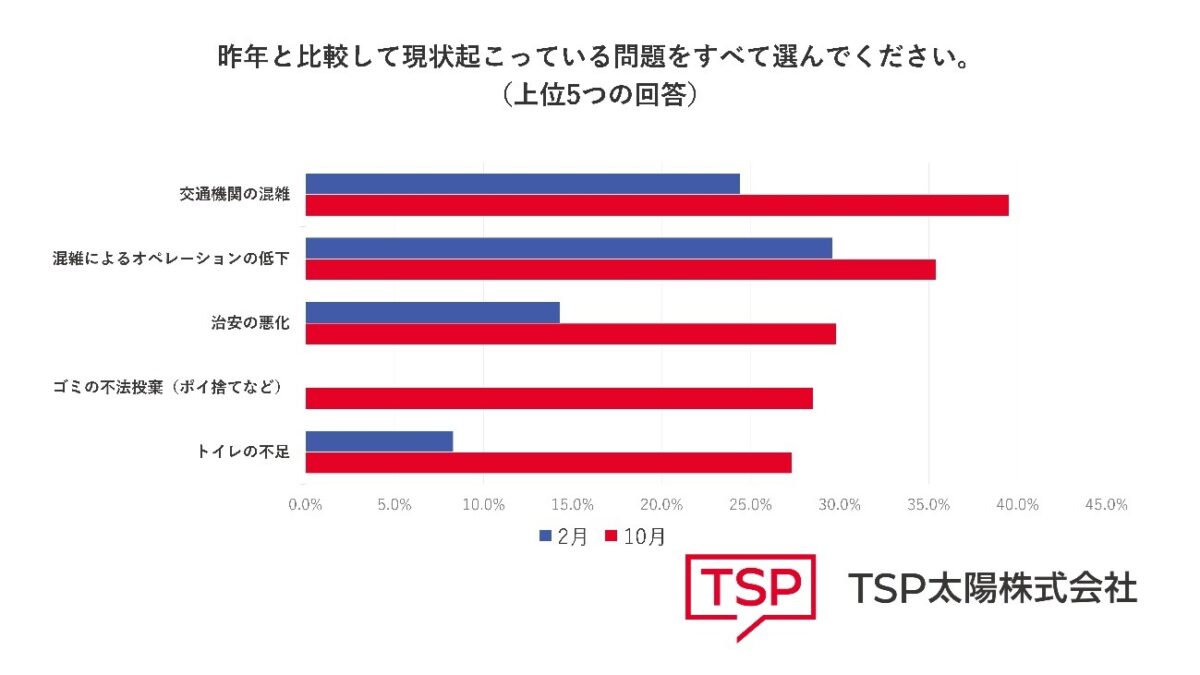 「現在と2022年を比較して、現状起こっている問題をすべて選んでください」という問いに対し、交通機関の混雑(39.5%)、混雑によるオペレーションの低下(35.4%)、治安の悪化(29.8%)、ゴミの不法投棄(28.5%)、トイレの不足(27.3%)が上位5項目を占めました、そのほかにも外国人とのコミュニケーションが取れない(26.2%)、マナーの違いによるトラブル(23.2%)、騒音問題(21.3%)となっており、外国人にまつわる課題が多くなっています。一方でクラスター(集団感染)への不安は前回の調査では34.0%でしたが、今回は21.2%まで下落しており、以前に比べるとクラスターへの不安は減っていることがわかります。また、前回の調査では人手不足が主な問題でしたが、現在は混雑によるオペレーションの低下やトイレ不足、外国人対応に課題が移っていると実情が明らかになりました。これからさらに観光客だけではなく訪日外国人数が回復し、サービスが行き届かなくなった結果、観光地の満足度を下げてしまう原因になりかねません。