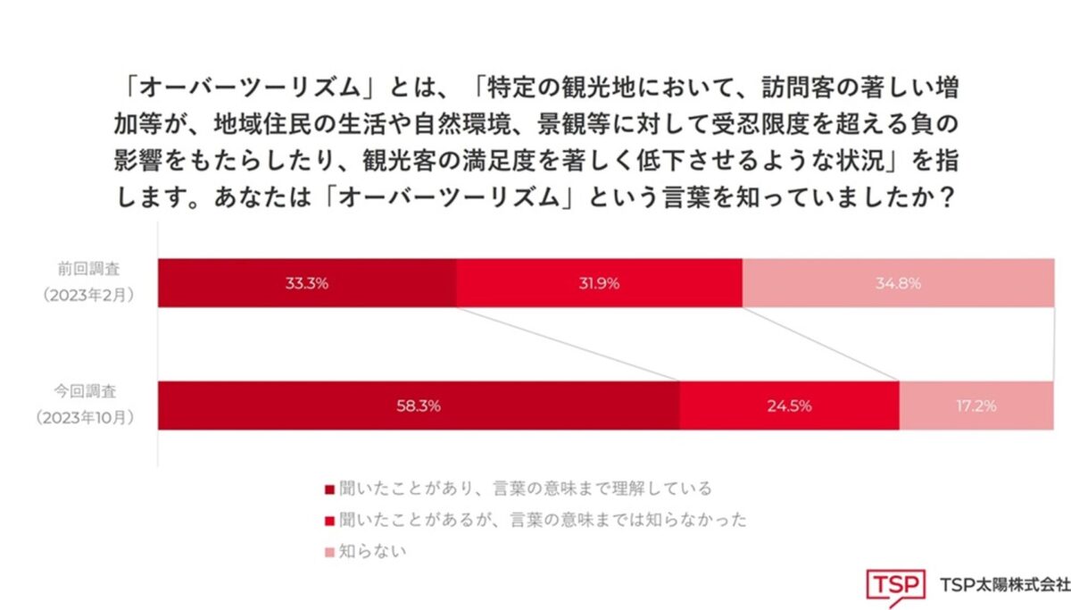 イベント制作やコンサルティング、空間プロデュース、PRなどを手掛けるTSP太陽株式会社(本社:東京都目黒区、代表取締役社長 池澤 嘉悟、以下「TSP太陽」)は、観光業にかかわる534名に“オーバーツーリズム”に関するアンケートを実施し、その結果を発表いたします。当社は今年2月にも同様の調査をしており、その結果と比較した現在の観光業への影響とオーバーツーリズムにおける課題が判明しました。