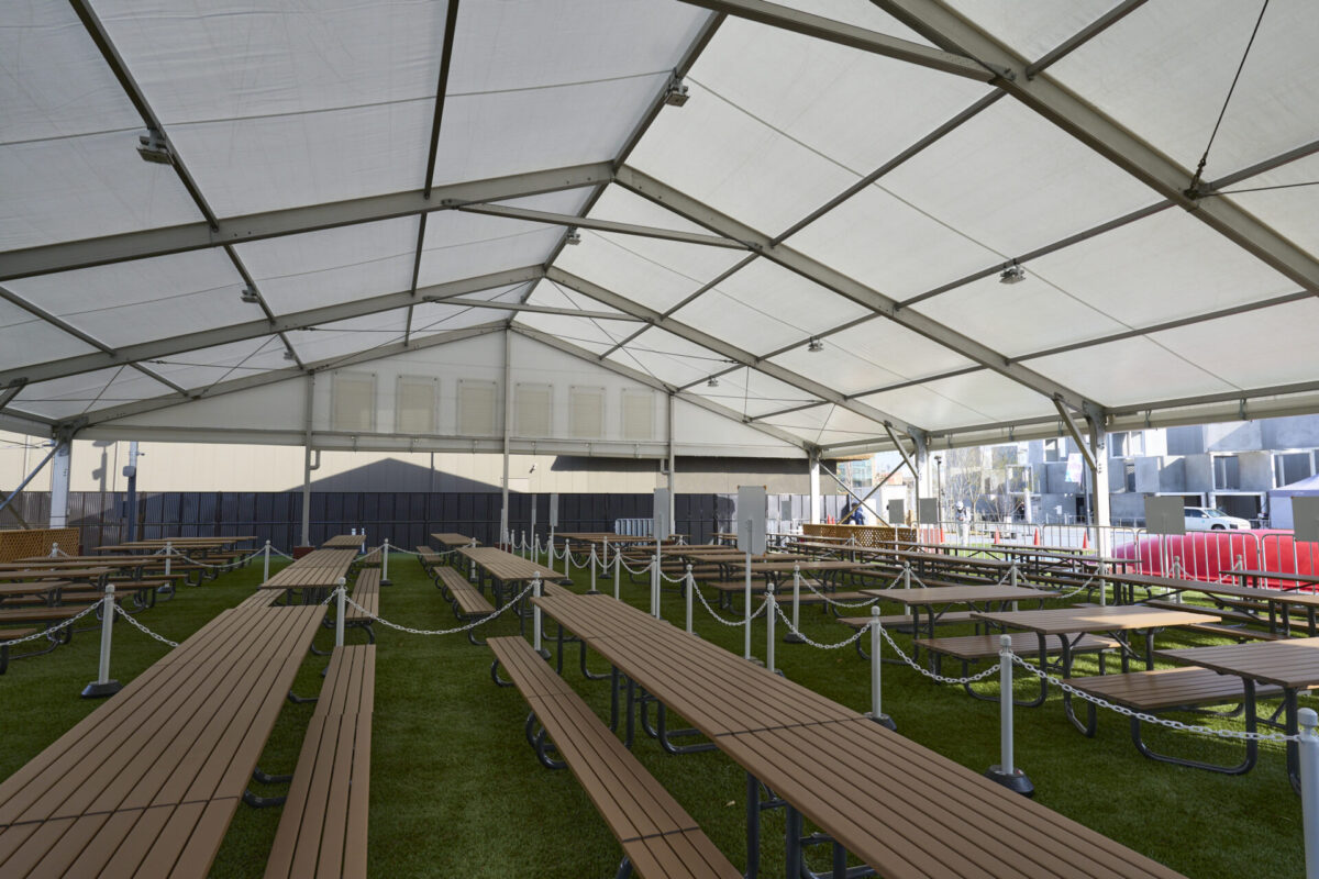 使用されたのは、柱のない広々とした構造が特徴の大型テント「GRANDE」です。「GRANDE」の風や雨に強い構造を活かし、多くの来場者が安心して過ごせる日よけ・雨よけの空間として活用されました。
