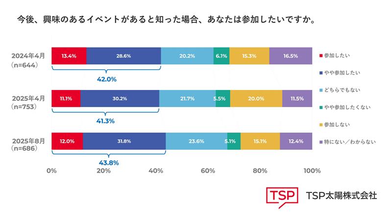 「今後、興味のあるイベントがあると知った場合、あなたは参加したいですか」という質問に「参加したい」「やや参加したい」と回答した人の割合は、2024年4月が42.0%、2025年4月が41.3%、2025年8月が43.8%とほぼ横ばいとなっています。それに伴い「参加しない」と回答した方は、2025年4月の20.0%から、8月は15.1%へと減少しています。