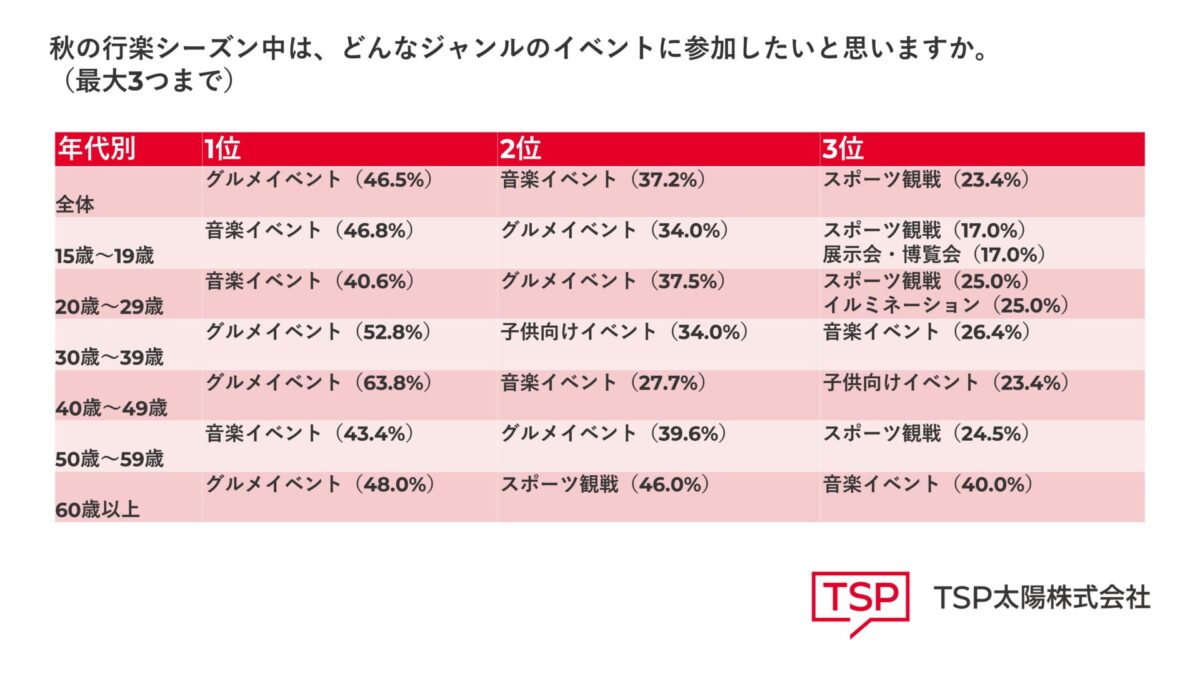 TSP太陽株式会社(本社:東京都目黒区、代表取締役社長 池澤 嘉悟、以下「当社」)は、ゴールデンウィーク前に引き続き、10代~70代にイベントに関するアンケートを実施しました(有効回答数:958名)。調査の結果、イベントへの参加意欲があると回答した方は、ゴールデンウィークに引き続きほぼ同等の水準となりました。中でも「グルメイベント」の人気は根強く、今回の調査でも46.5%以上が「参加したい」と回答しました。