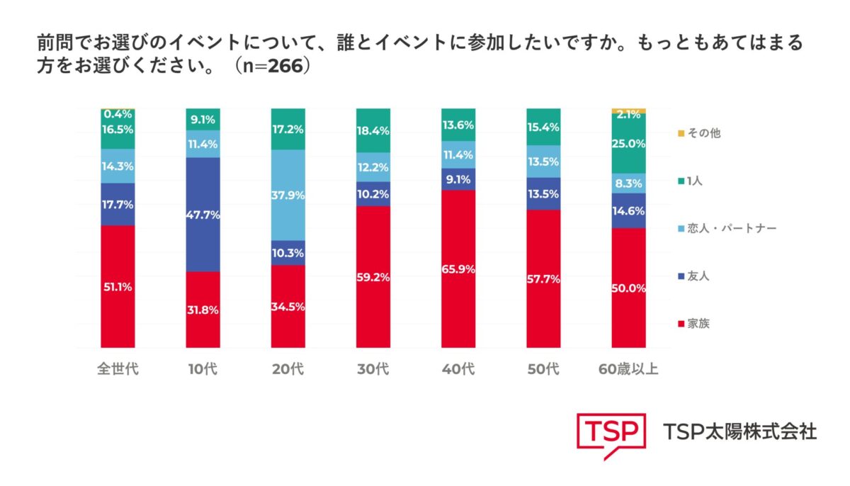 特徴的だったのは30代以上です。全世代で「家族」という回答が1位となり、家族でイベントを楽しみたいという意向が伺えます。