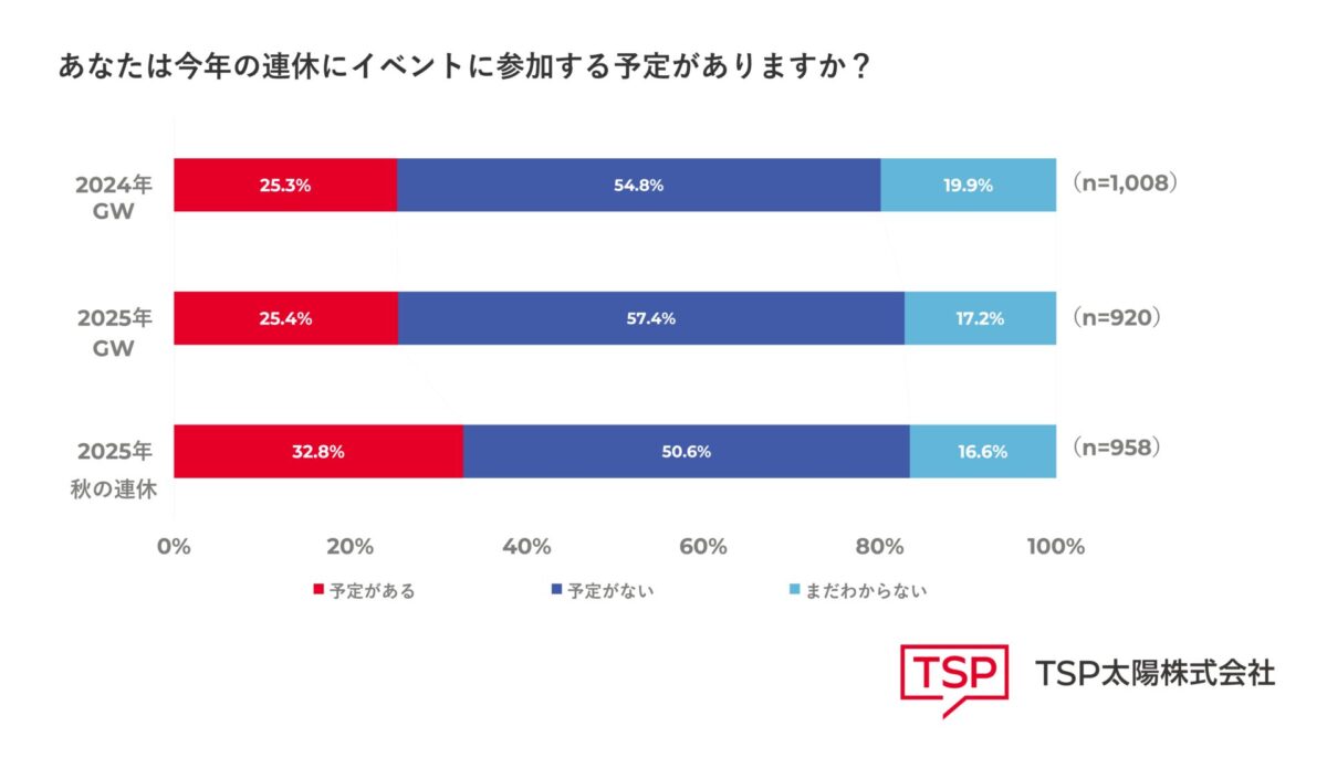 「あなたは、今年(2025年)の9月や10月の連休など、秋シーズンにイベントに参加する予定がありますか」と質問したところ、「予定がある」と回答した人は32.8%でした。2024年・2025年4月の調査時は「予定がある」の回答が約25%だったことに比べると、イベントへの参加意欲が向上していることが分かります。