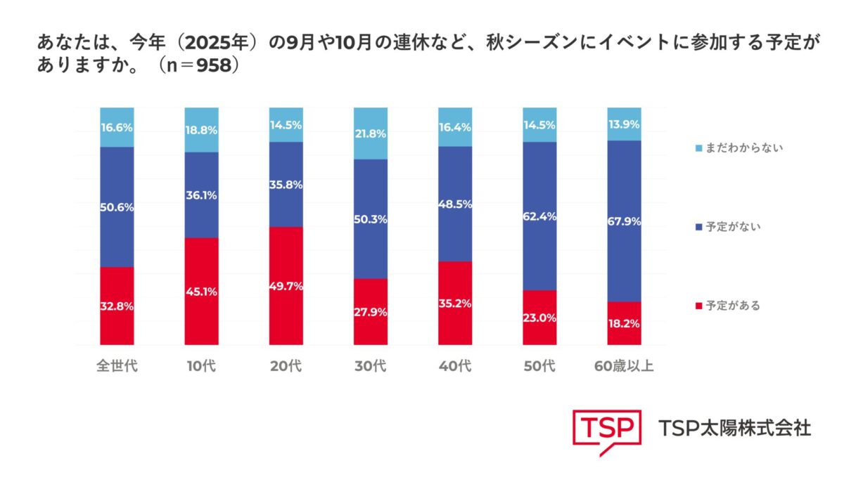 世代別の結果では、10代の45.1%、20代の49.7%が「予定がある」と回答。一方で30代の50.3%、40代の48.5%、50代の62.4%、60歳以上の67.9%が「予定がない」と回答しました。10代・20代のイベント参加意欲は高い水準であるものの、30代以上の世代では「予定がない」「まだわからない」という回答が過半数を占めています。