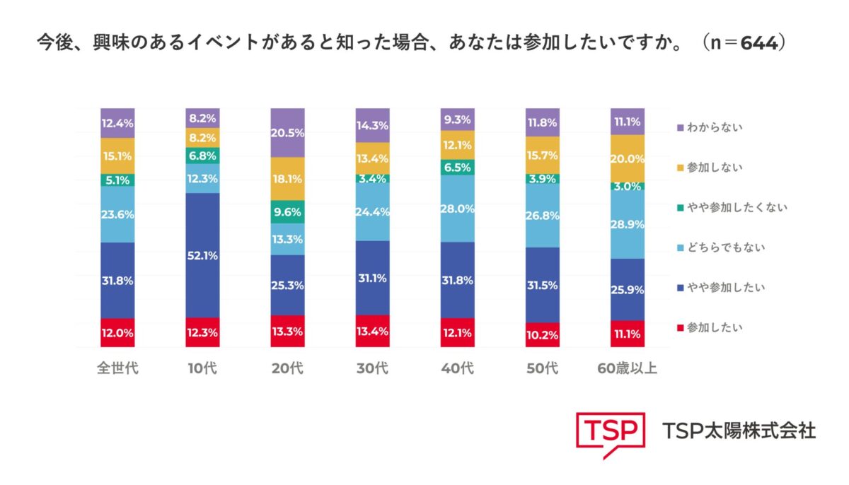 世代別の結果では、10代の「参加したい」「やや参加したい」と回答した人の割合が64.4%と最も高く、イベントへの参加意欲が他の世代と比較して高い傾向にあることがわかりました。