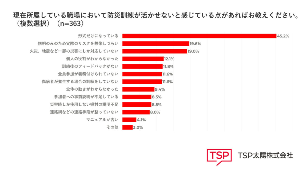 一方で、現在所属している職場において防災訓練を活かせないと感じている点を聞いたところ、最多の回答が「(防災訓練が)形式だけになっている」で45.2%でした。続いて「説明のみのため実際のリスクを想像しづらい」(19.6%)、「火災・地震など一部の災害にしか対応していない」(19.0%)、「個人の役割がわからなかった」(12.1%)、「訓練後のフィードバックがない」(11.8%)、「全員参加が義務付けられていない」(11.6%)、「傷病者が発生する場合の訓練をしていない」(11.6%)という結果になりました。訓練参加者からは、どのような災害が発生しても自発的に対応できる訓練が求められています。
