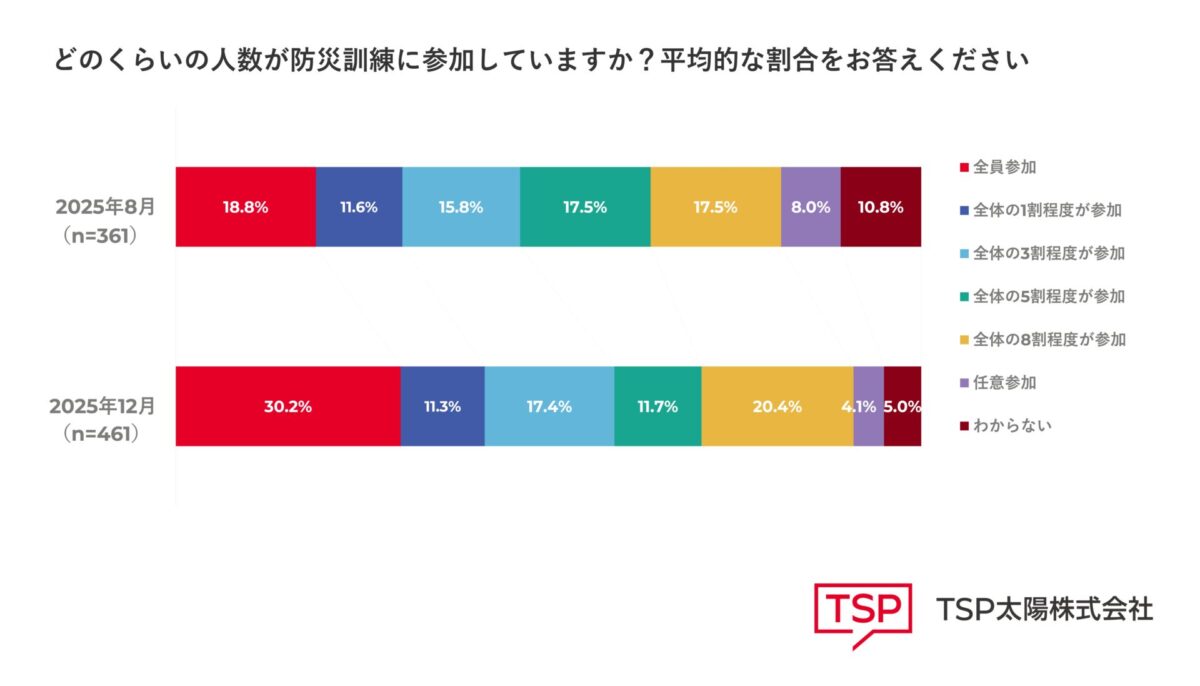 どのくらいの人数が防災訓練に参加しているかを聞いたところ、「訓練に全員が参加している」という回答が2025年8月の調査では18.8%でしたが、今回の調査では30.2%に上昇していることがわかりました。次いで多い回答は「全体の約8割程度が参加」という回答で20.4%でした。