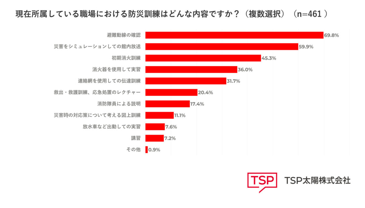 TSP太陽株式会社(本社:東京都目黒区、代表取締役社長 池澤 嘉悟、以下「TSP太陽」)は、会社員533名に防災訓練に関するアンケートを実施。防災意識や防災訓練の内容などの実態を明らかにしました。