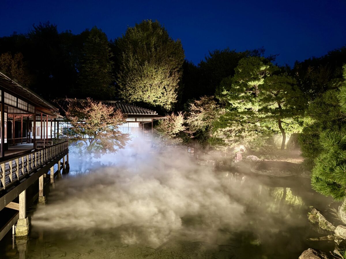 今年は、臨池亭 (りんちてい)前の池泉に「雲海」が初登場します。庭園内に雲のように漂う雲海に浮かぶ紅葉や幻想的な世界をお楽しみいただけます。臨池亭の建物内から、まるで雲の上にいるような感覚になりながら、幻想的に光る庭を眺めることができます。また京都タワーを臨む名勝庭園の美しい景色も期間限定で撮影可能です。