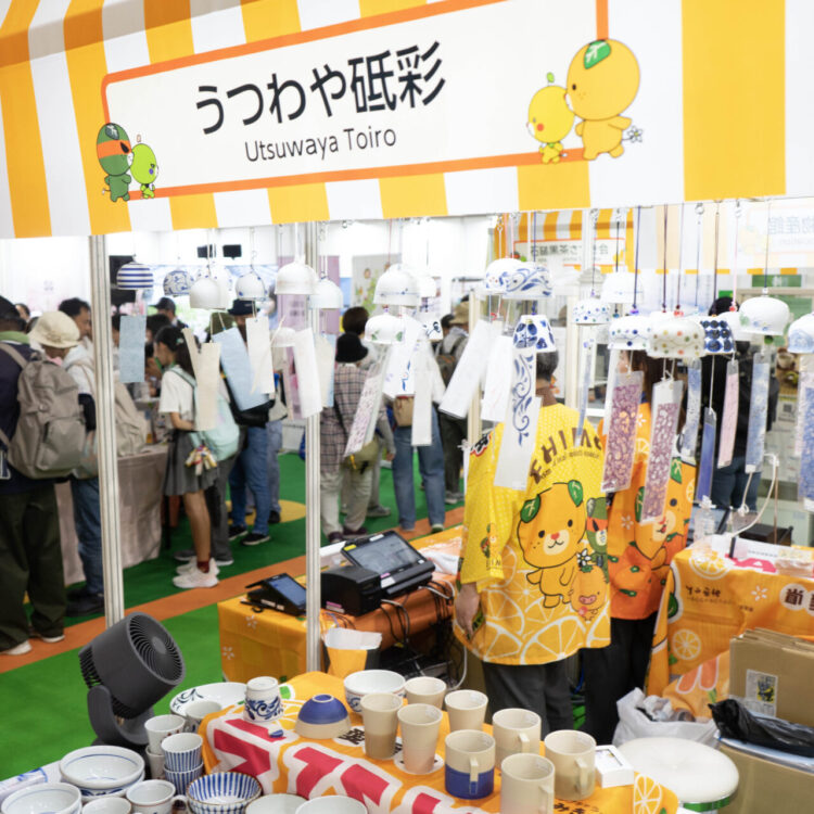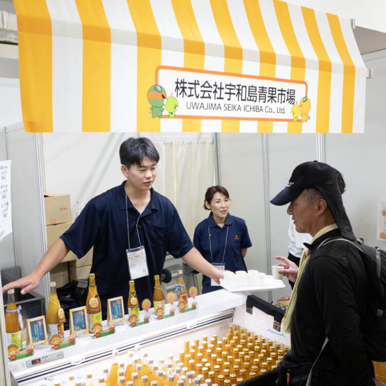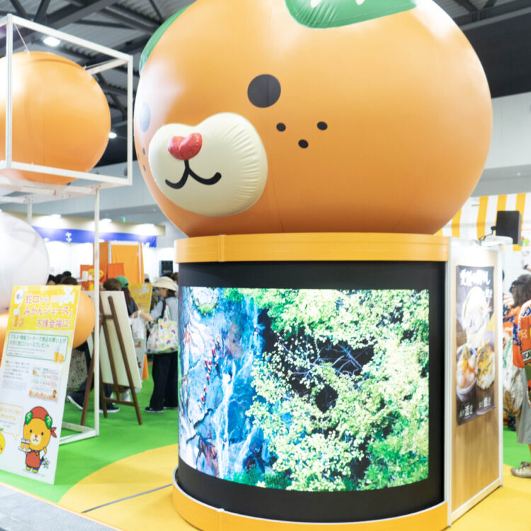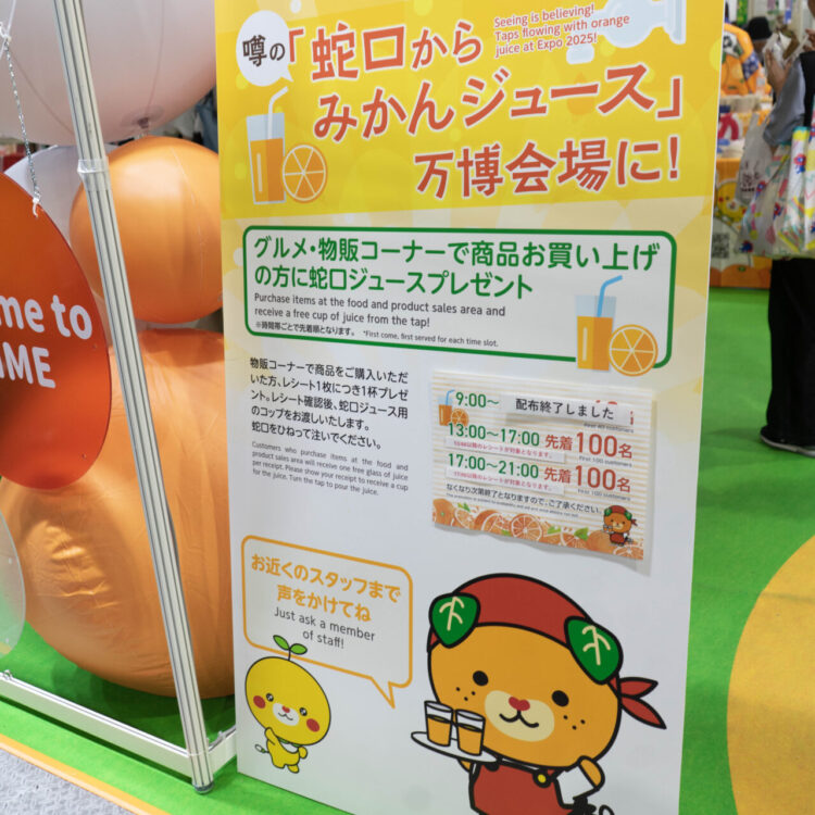 大阪・関西万博会場の西エリアにあるイベントスペース「EXPOメッセ『WASSE』」にて、5日間限定で愛媛県ブースを出展。コンセプトは「疲れたら、愛媛。~愛媛の癒しを五感で体感~」。愛媛のご当地グルメ「じゃこ天」の実演販売や、蛇口から出るみかんジュースなどの飲食・物販のほか、VRサイクリングや地元高校生による書道パフォーマンスなどのイベントを日替わりで実施。愛媛の魅力がぎゅっと詰まったブースとなりました。