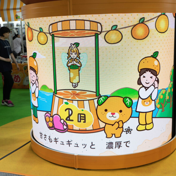 また、日替わりステージの音響・進行も担当。初日のオープニングセレモニーでは県のキャラクター「みきゃん」と万博公式キャラクター「ミャクミャク」がそろって登壇。中村時広愛媛県知事と一緒にみかんジュースで乾杯しました。
