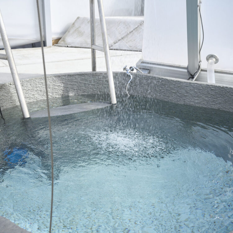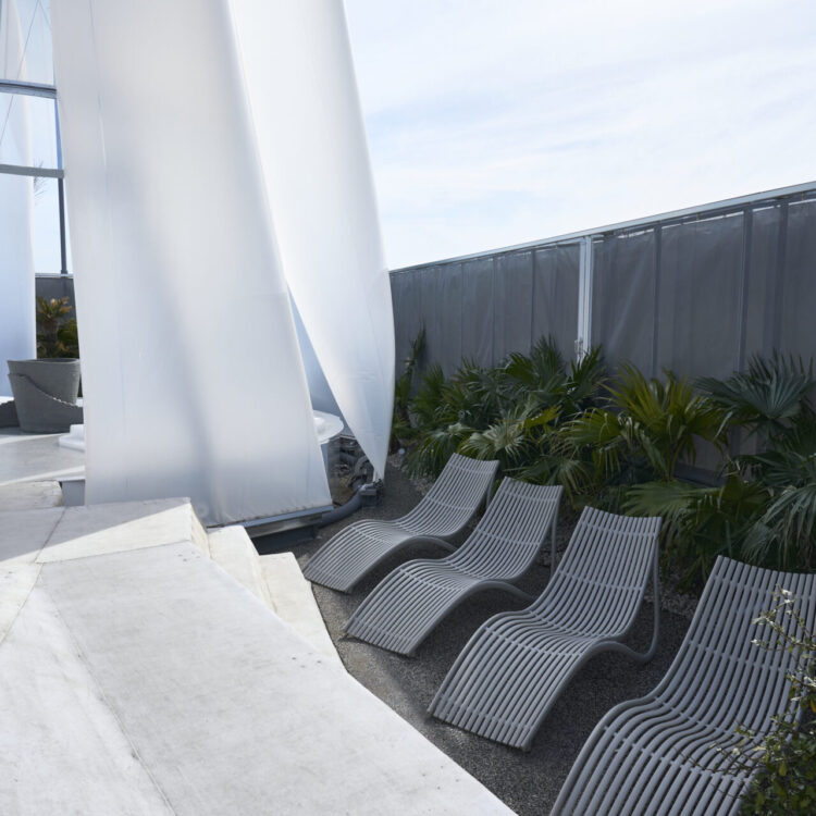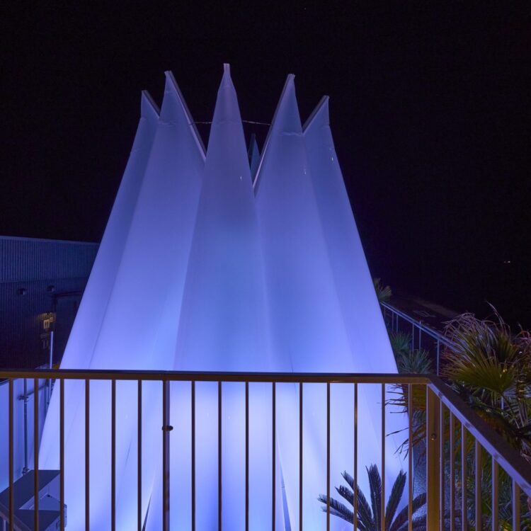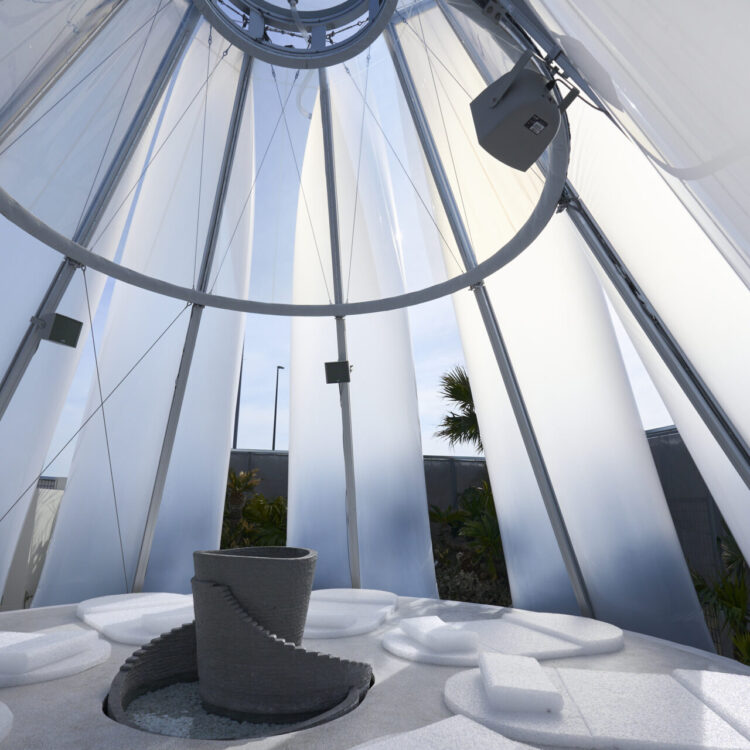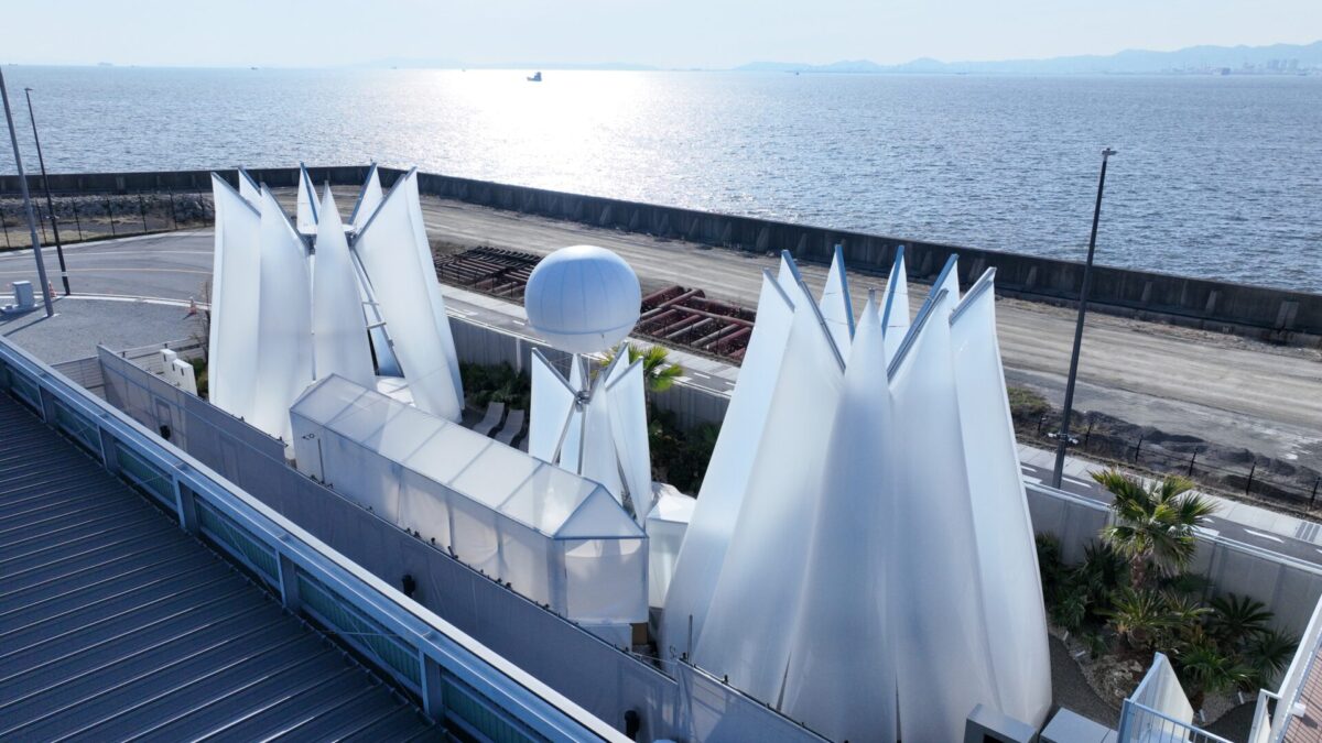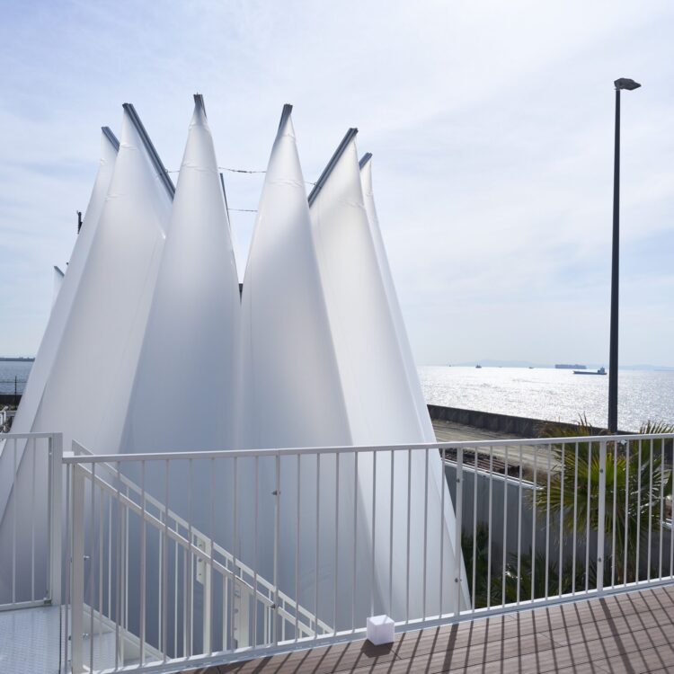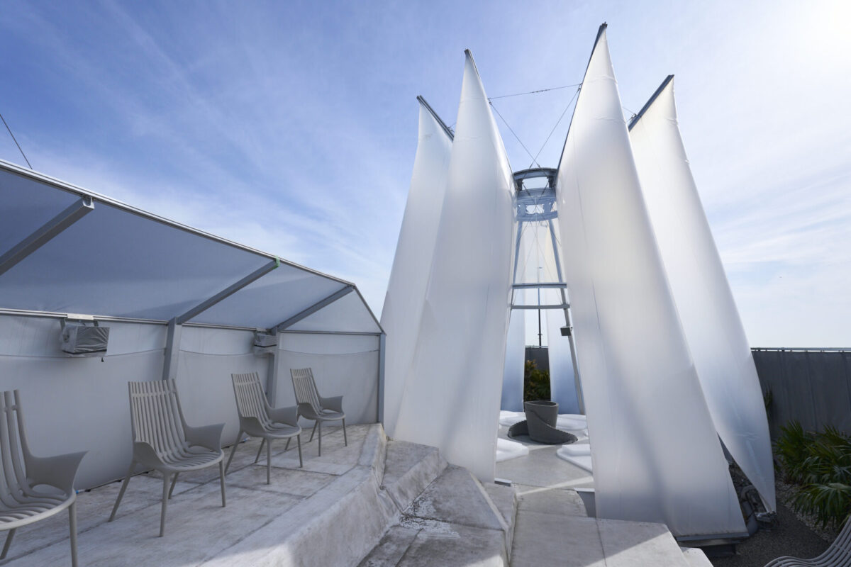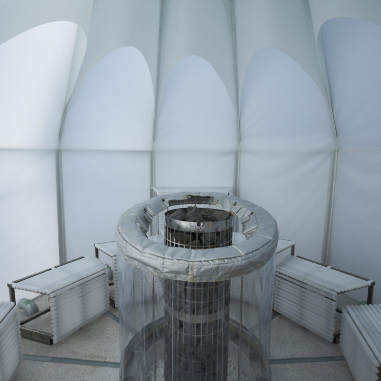 花びら風の空気膜クッションが集まって一つのつぼみとなり、太陽に向かって伸びていくような生命力溢れる美しい造形が特徴です。太陽のエネルギーが海、草⽊、⾵の空気をまとって「太陽のつぼみ」に降りそそぎます。繊細で⼒強い膜が創り出す空間に、⾃然のエネルギーが満ちていき、私たちの⼼と体を調わせ、⼈としての原点に回帰させていくことをイメージしています。自然光を透過するETFEフィルム膜材に覆われた空間の中で、期間中に約1万5千人の方が水着でサウナを楽しむことができます。