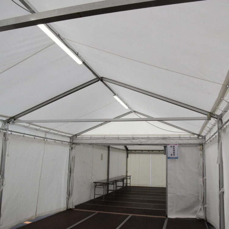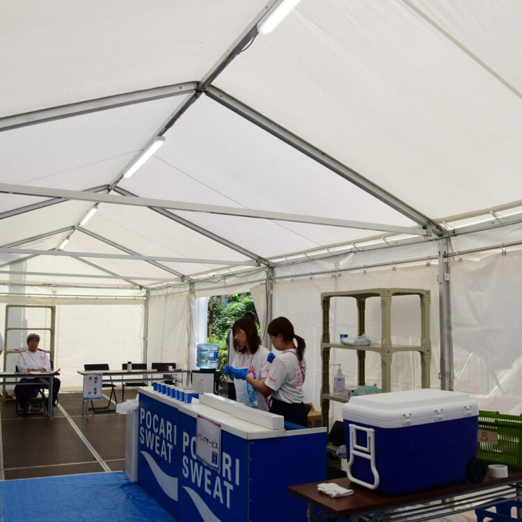 また、選手が使用する仮設トイレも当初は外に設置する予定でしたが、選手動線上のテント内に配置したことも改善点の一つです。仮設トイレの高さや幅の調整・確認を行うことで実現することができました。