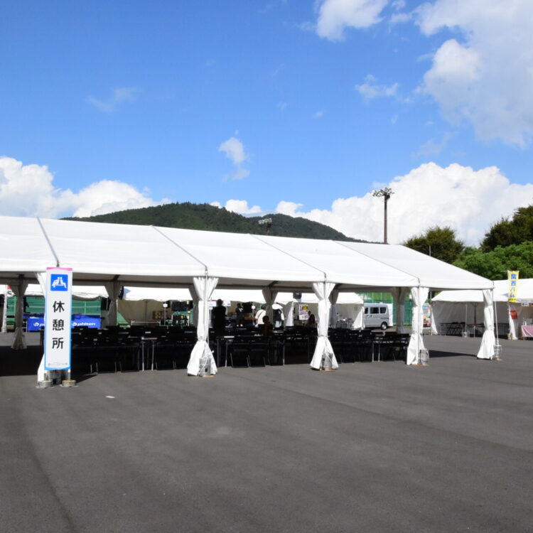 当社では修正設計(会場図面・積算書など)、会場設置備品の手配、お成り(賓客対応)の備品手配、会場設営(テント等仮設物や会場内備品の設置等)、会期中メンテナンス、撤去作業などを担当しました。